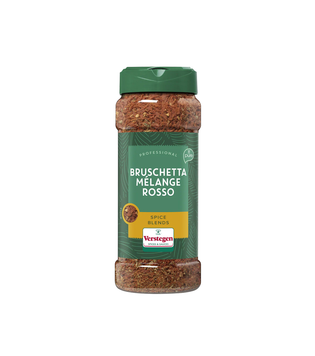 Mots-clés : bruschetta rosso, mélange méditerranéen, épices italiennes, ail tomates herbes, assaisonnement bruschetta, Verstegen PURE, strooibus medium
