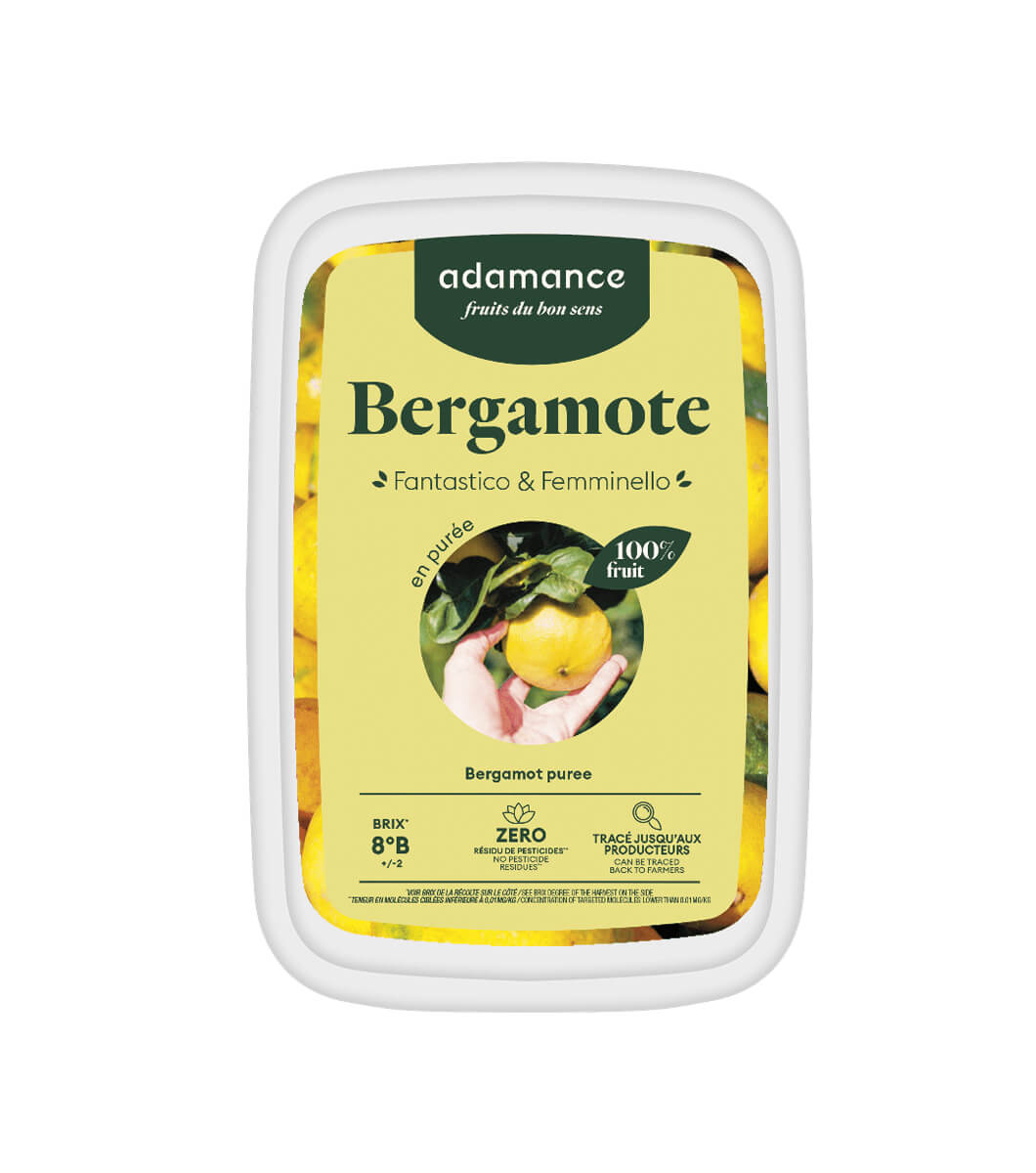 Purée de bergamote surgelée Adamance 100% fruit – variétés Fantastico et Femminello, origine Italie. Sans sucre ajouté, sans additifs, frais et amer. Idéale pour pâtisserie, glaces et desserts.