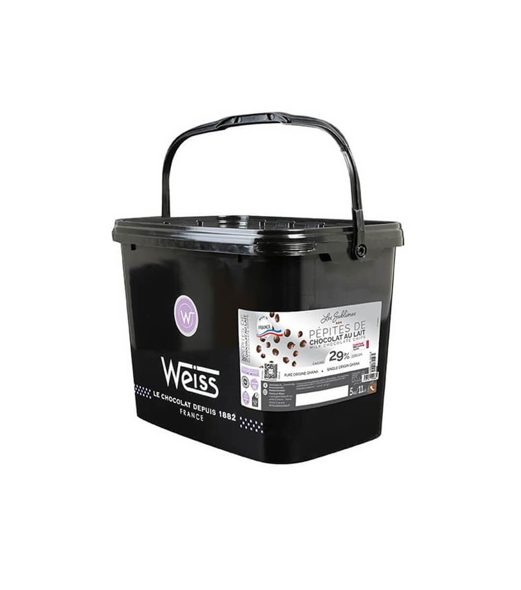 Mots-clés : pépites chocolat au lait 29%, chocolat pâtisserie, pépites cuisson professionnelle, chocolat Weiss Maroc, pépites gourmande