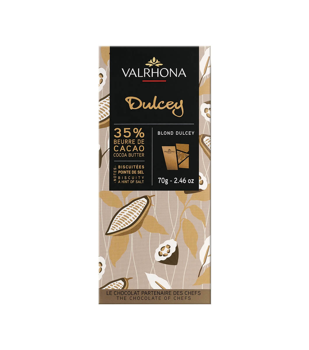 Découvrez la tablette de chocolat de couleur blonde Dulcey 35% de Valrhona, une création unique qui invite à un voyage sensoriel inédit. Avec ses notes de biscuit légèrement salé et de lait caramélisé, Dulcey incarne la douceur réconfortante et l’originalité, séduisant aussi bien les amateurs de chocolat que les palais curieux en quête de nouvelles sensations.